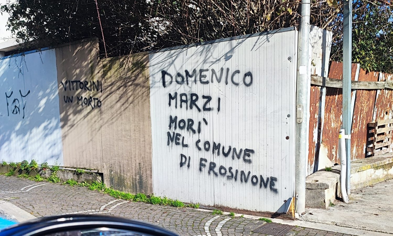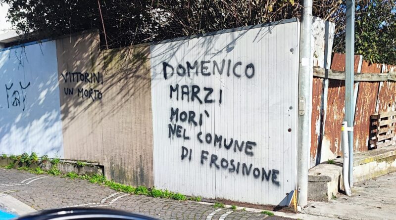 Sono apparse su un muro in Via Puccini, nel quartiere Scalo a Frosinone alcune scritte sui muri tra le quali, una, dedicata all’ex sindaco e attuale consigliere comunale Domenico Marzi. La scritta recita “Domenico Marzi morì nel comune di Frosinone”. Le altre recano altri nomi con la stessa dicitura. Cosa voglia dire quest’opera di ignoti non è chiaro. Certamente non si tratta di messaggi benevoli. Accertamenti in corso.