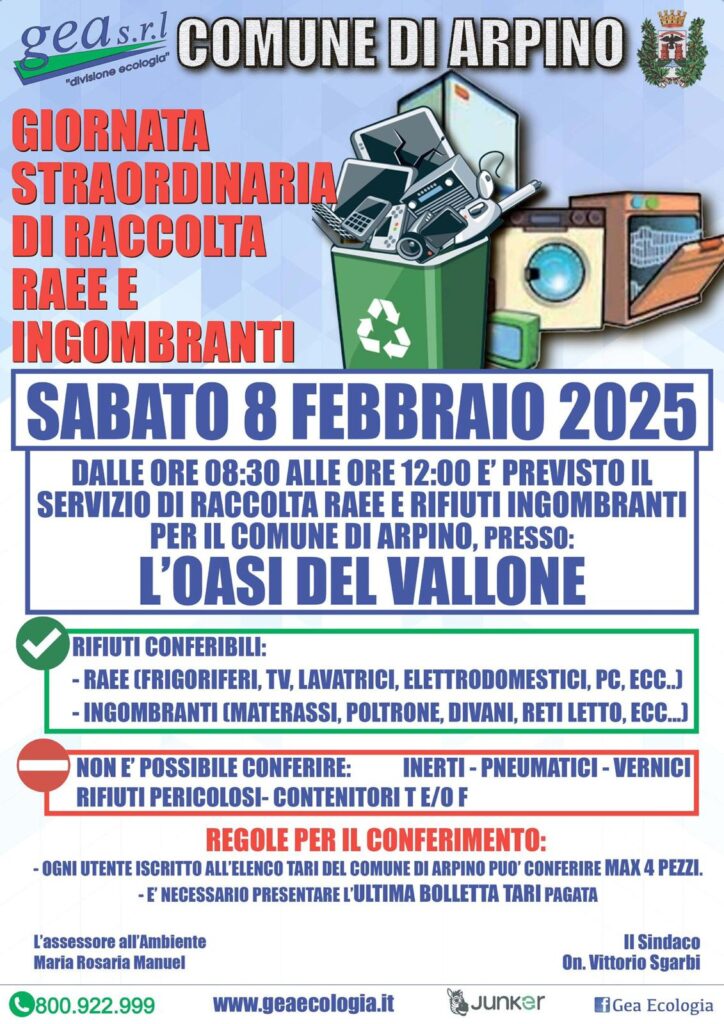 Giornata straordinaria di raccolta RAEE e ingombranti, sabato prossimo, 8 febbraio, presso l’Oasi del Vallone di Arpino. L’orario in cui si potranno portare i rifiuti è dalle 8 :30 alle 12:00.