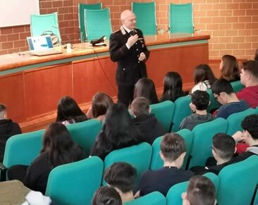 Nell’occasione, gli studenti hanno potuto conoscere le varie articolazioni dell’Arma dei Carabinieri, con la visione di un breve video che ha illustrato i compiti istituzionali e le funzioni quotidianamente assolte al servizio delle comunità e dei cittadini, scoprendo che i Carabinieri hanno tante specialità come i Carabinieri Forestali, NAS, RIS, GIS, Subacquei, Sciatori, ecc. e soprattutto quella che rappresenta la spina dorsale, ovvero l’Arma Territoriale, quella cioè, più vicina alla cittadinanza con le sue Stazioni e Tenenze. L’incontro ha destato forti interessi ed ha attirato l’attenzione di tutti gli studenti che hanno vivamente partecipato con domande sempre più pressanti e dirette, anche in considerazione delle conseguenze penali e non che possono derivare da comportamenti illeciti.