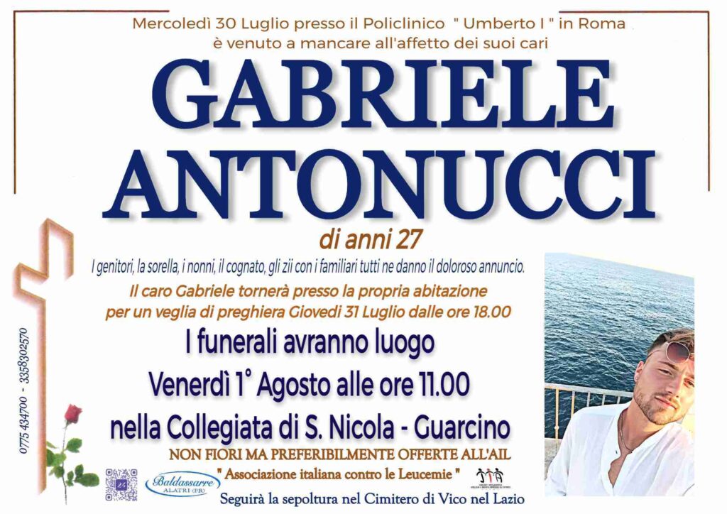 La salma di Gabriele Antonucci farà ritorno oggi (giovedì 31 luglio) a Guarcino dove alle 18, presso la sua abitazione, ci sarà una veglia di preghiera. I funerali si svolgeranno invece domani (venerdì 1° agosto) alle 11 nella Collegiata di San Nicola a Guarcino (seguirà la sepoltura nel cimitero del vicino centro di Vico nel Lazio).