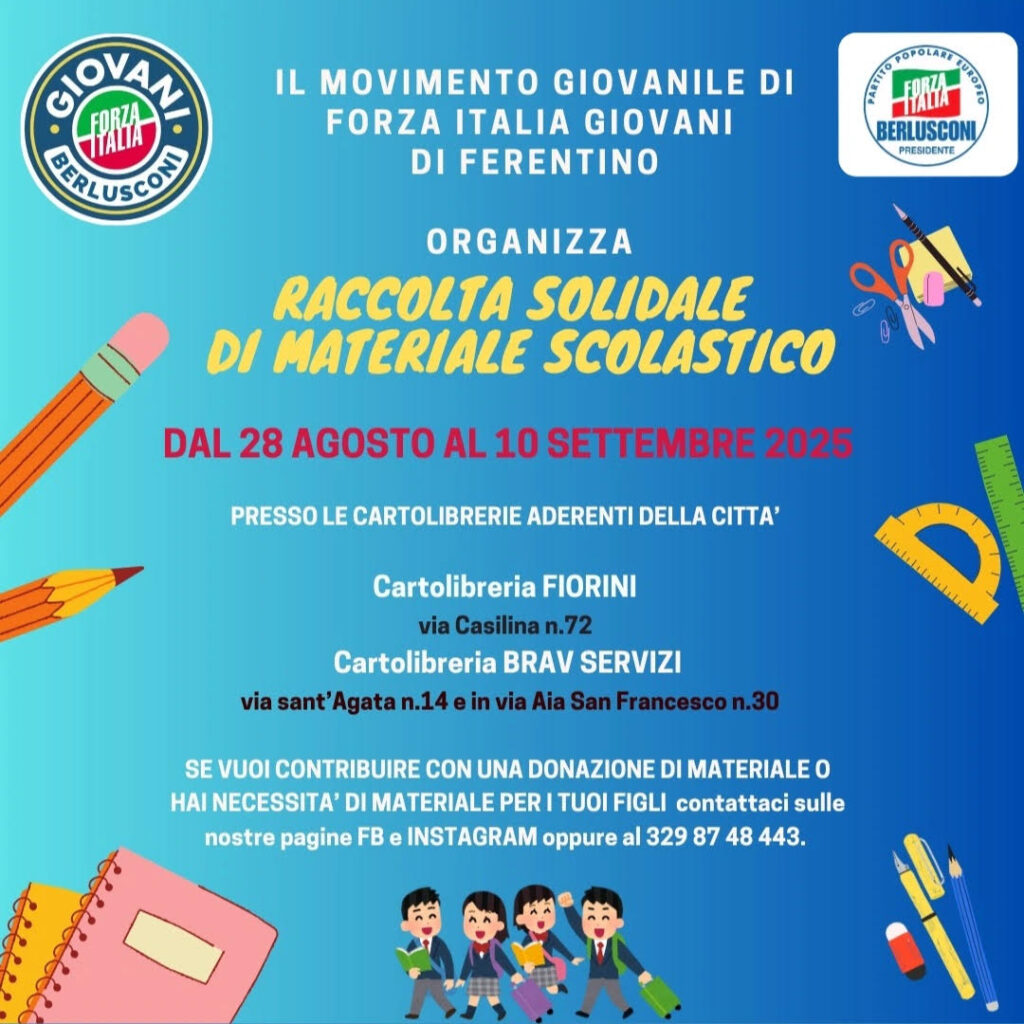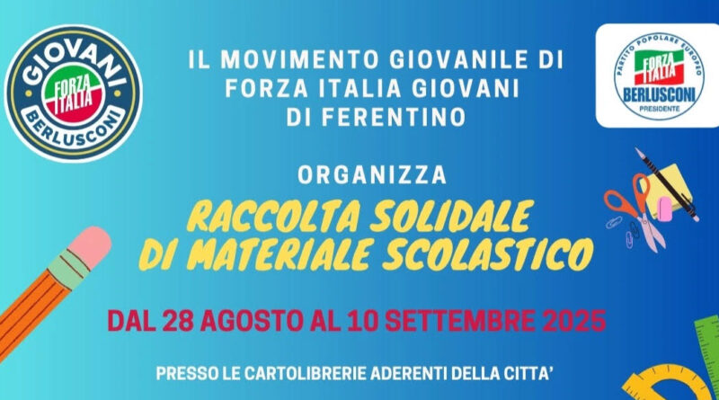 Arriva sul territorio gigliato l’iniziativa sociale “Raccolta di Materiale Scolastico” promossa dal gruppo giovanile di Forza Italia Giovani Ferentino, coordinato da Claudia Angelisanti.