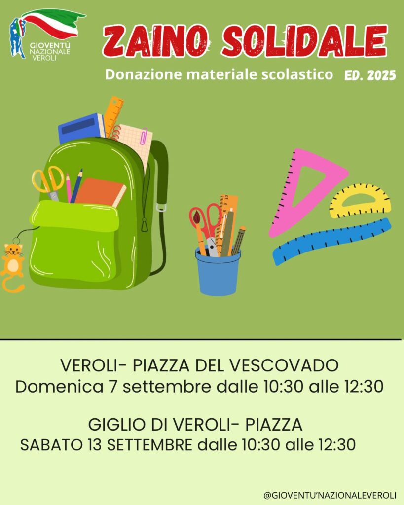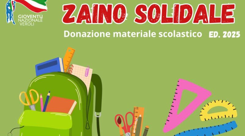 Gioventù Nazionale Veroli rinnova anche quest’anno l’impegno con Zaino Solidale, l’iniziativa di raccolta di materiale scolastico destinato alle famiglie in difficoltà. Il primo appuntamento si terrà domenica 7 settembre nel centro di Veroli mentre il secondo ci sarà sabato 13 settembre in località Giglio di Veroli presso la piazza del Giglio. In entrambe le giornate sarà presente il banchetto allestito nelle piazze, dove chiunque potrà donare quaderni, penne, zaini, astucci e altro materiale utile per la scuola.