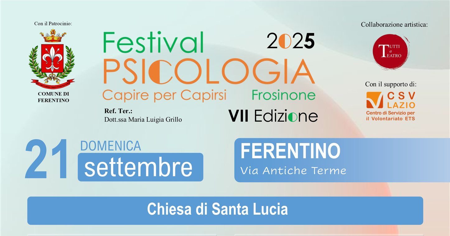 Ferentino ospita la VII edizione del “Festival della Psicologia Frosinone – Capire per Capirsi“. Un progetto itinerante che fino a novembre 2025 attraverserà tredici comuni della provincia di Frosinone con un unico grande obiettivo: portare la cultura psicologica tra le persone, nelle piazze, nei teatri e nelle coscienze. Sarà proprio la città gigliata ad ospitare l’ottava tappa della manifestazione itinerante, nata a Monte San Giovanni Campano nel 2017 ad opera del referente, Dott. Alessio Silo, la quale vede la collaborazione di diverse amministrazioni locali e il supporto di numerose realtà associative e professionali del territorio. L’evento è patrocinato dal Comune di Ferentino.