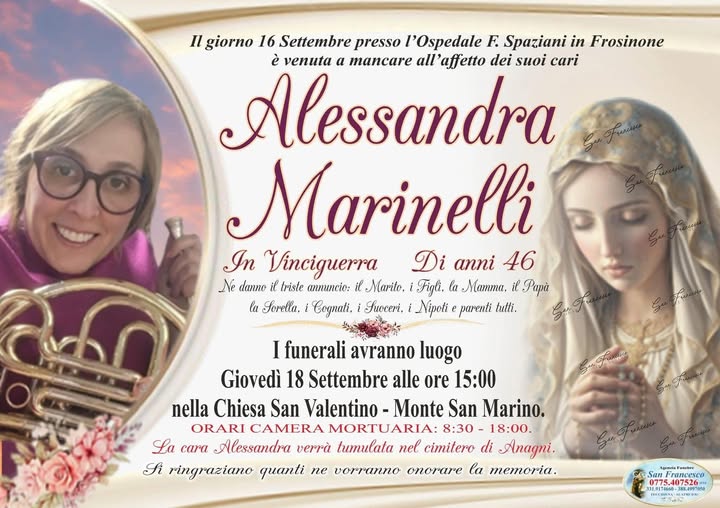 La notizia della morte di Alessandra Marinelli, in Vinciguerra (conosciuta ad Alatri anche per il suo impegno e la sua passione per la musica, faceva parte con orgoglio della Banda Musicale cittadina) si è subito diffusa e nelle ultime ore sono stati già centinaia i messaggi di cordoglio e vicinanza ai suoi cari. Tutti stretti in un abbraccio virtuale al marito, ai figli, ai genitori, alla sorella, ai cognati, ai suoceri, ai nipoti e a tutti gli altri parenti, ai quali è toccato il triste compito di dare una notizia che mai avrebbero voluto dare e che li segnerà per tutta la vita.