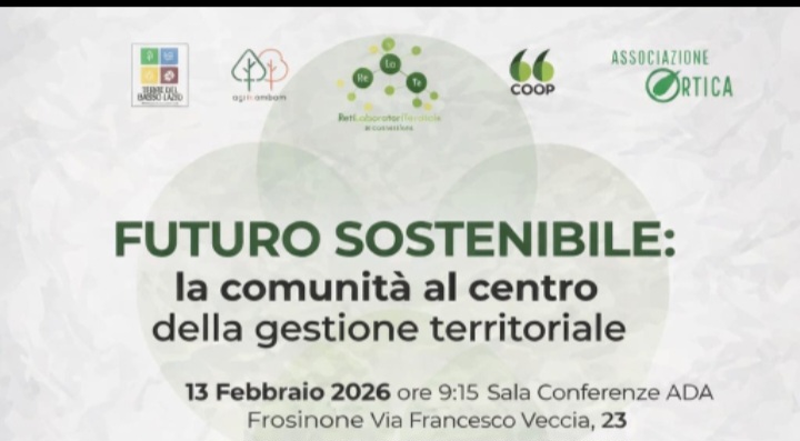 “Futuro sostenibile: la comunità al centro della gestione territoriale”. Questi i temi al centro del convegno promosso dal Network Re.La.Te. (Reti, Laboratori e Territori) in programma venerdì 13 febbraio 2026, a partire dalle ore 9:15, presso la Sala Conferenze dell’Area Decentrata Agricoltura (ADA) di Frosinone, in via Francesco Veccia 23.