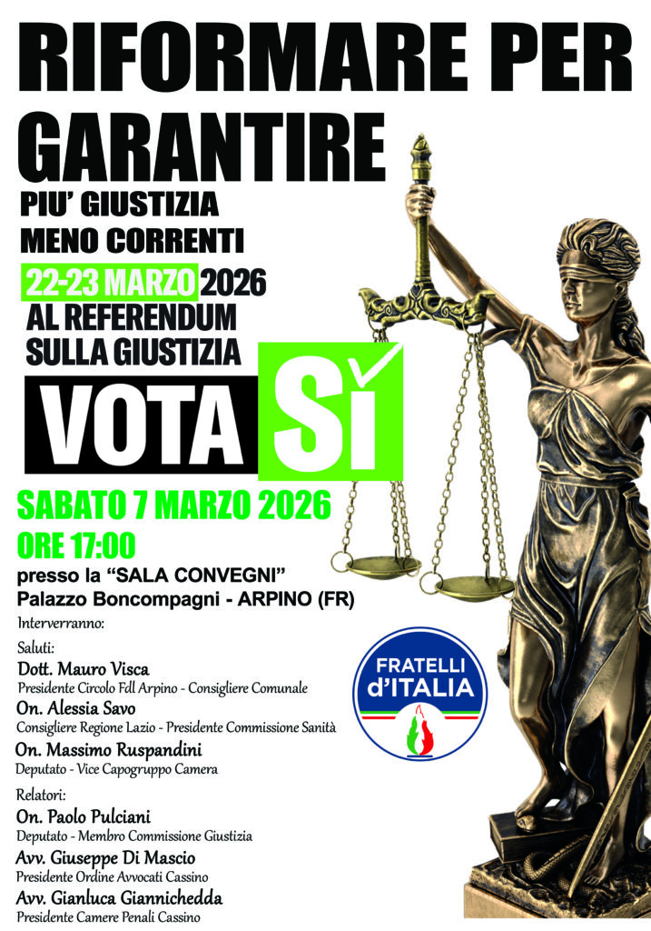 Si terrà sabato 7 marzo alle ore 17.00, presso la Sala Convegni di Palazzo Boncompagni ad Arpino, un incontro pubblico dedicato al referendum sulla giustizia del 22 e 23 marzo, promosso da Circolo di Fratelli d’Italia di Arpino a sostegno del SÌ alla riforma.