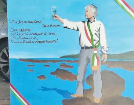 L’opera mostra Angelo Vassallo in piedi sulla sua amata costa del Cilento. Nel quadro il sindaco guarda verso l’orizzonte e solleva un calice: un gesto che simboleggia l’amore profondo per la sua terra e le tradizioni che ha sempre cercato di proteggere. Accanto alla sua figura spicca una frase che è un vero e proprio motto di vita: “Mai fermi, mai domi”.